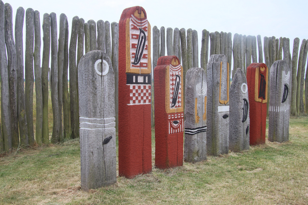 Das betrifft in diesem Fall besonders die Muster, Symbole und Farben, mit denen die Pfosten und auch die anderen Gegenstände verziert sind. Die Archäologen orientierten sich nach eigenen Aussagen an erhalten gebliebenen Funden aus der gleichen Epoche - der sogenannten Glockenbecherzeit.Diese Funde waren mit klaren geometrischen und farbigen Formen verziert. Die Form der Palisaden mit zwei Pfosten und querliegendem Balken erinnert an die Bauart von Objekten wie dem Steinkreis von Stonehenge.