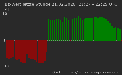 Schon zuverlässiger bezüglich des Auftretens von Polarlicht ist der Wert von Bz. Im Unterschied zu Kp ist hier die magnetische Flußdichte bzw. magnetische Induktion B die ausschlaggebende Größe. B ist eine vektorielle Größe, besteht also aus einem Betrag und einer Richtung, setzt sich aus den Komponenten Bx, By und Bz zusammen. Vor allem Bz ist hier von Bedeutung, denn die z- Achse verläuft im Bezug auf das Erdmagnetfeld in Nord-Süd-Richtung. Ist Bz negativ, B also südwärts gerichtet, kann es zu Rekonnektionen des Erdmagnetfeldes mit dem solaren Plasma kommen; es fließen starke Ströme, die zur Entstehung von Polarlichtern führen können. Natürlich ist das nur eine unvollständige Darstellung der Vorgänge. Der wesentliche Aspekt ist aber, daß nur negative Werte von Bz zu Polarlichtern führen; und je länger anhaltend, umso wahrscheinlicher.