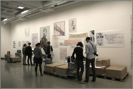 Die Künstlerin hat Berge ihres Privatarchivs erforscht. Jeder Besucher kann sich Reproduktionen alter Notizen mitnehmen, die sich in großen Kisten im Raum stapeln. Hier findet man auch die Plakate mit Sprüchen, die von ausgewählten Personen am Eröffnungstag durch die Stadt getragen wurden.