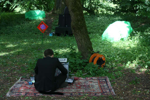 Der Künstler sitzt im Schatten eines Baumes und bedient Mischpult und Verstärker. Eintönige Rhythmen sind wiethin hörbar und locken ein breites Publikum an.