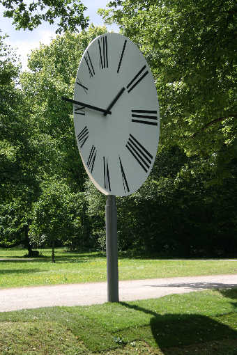 Das Kunstwerk ist eine Herausforderung an unsere räumliche Wahrnehmung. Perspektivisch verzerrt, bietet sich nur aus einem ganz bestimmten Betrachtungswinkel ein für uns gewohnter Anblick. Die Anregung dafür holte sich der Künstler aus der Sammlung des Astronomisch-Physikalischen Kabinetts in der nahen Orangerie. "Aufgestellt am hinteren Ende des Hirschgrabens ... zeigt die Uhr die Zeit perspektivisch an und vermisst ihre eigene Gestalt«.<i/>