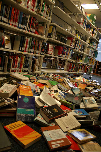 Zerstörung und das Erzeugen von Unordnung sind Merkmale, die sich durch das Werk des Künstlers ziehen. Hier hat er sich die Jugendbibliothek vorgenommen. Im Katalog zur d13 liest man darüber: "Faldbakken dient diese gewaltsame Neuordnung dazu, ein Feld des Nichtseins und des Ohne-Arbeit-Seins einzurichten, wodurch das Buch über sich hinaus - und einer anderen Bedeutung entgegenwächst, die als verständliche und lesbare noch der Zukunft angehört.".