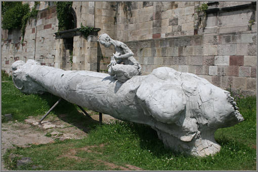 Eine sehr eigenartige, schon im Vorfeld vielfach diskutierte Plastik: Eine Frau, auf einem riesigen Knochen sitzend, säugt ein Ferkel.