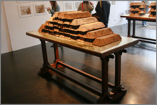 Auf vergoldeten Tischen hat die Künstlerin, die vor allem durch ihr Engagenment gegen die Agrar- und Genlobby bekannt ist, Barren aus kompostierter Erde gestapelt. Sie stellt sich diese Barren als eine alternative Währung vor und sagt dazu: "Bei diesem Projekt geht es um den Wert des Bodens, ich schlage damit eine neue Werteeinheit vor, eine Art neuer Währung, die den Petrodollar ersetzt".
