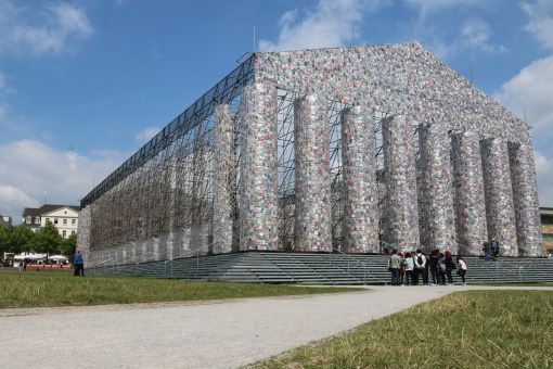 Marta Minujín schuf El Partenon de Libros (The Partenon Of Books) erstmals im Jahr 1983. 25000 Bücher, geborgen aus den Kellern, in denen sie die argentinische Militärjunta eingeschlossen hatte, bedeckten eine maßstabsgetreue Nachbildung der Akropolis auf einem öffentlichen Plattz in Buenos Aires. Diese archetypische Architektur diente als Symbol der ästhetischen und poltischen Ideale der ersten Demokratie der Welt... Für die Documenta 14 nahm Marta Minujín das Projekt wieder auf und sammelte verbotene Bücher aus der ganzen Welt. Zum Ende der Ausstellung werden die Bücher erneut der Öffentlichkeit übergeben.