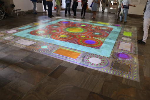 'The End' von Nikos Alexiou wurde durch das aus dem 11. Jahrhundert stammende marmorne Bodenmosaik des Klosters Ivirion inspiriert.... Die Videoprojektion besteht aus einer austauschbaren Matrix, die die Farbkombinationen der Mosaikdetails generiert. Die sich beständig in Drehung befindlichen Gruppierungen von Grundformen euklidischer Geometrie stellen dabei den Versuch einer Kosmologie dar, in der harmonische Ordnung und Geheimnis mittels digitaler Handarbeit untersucht werden.