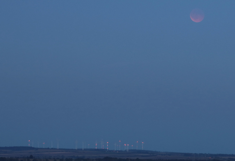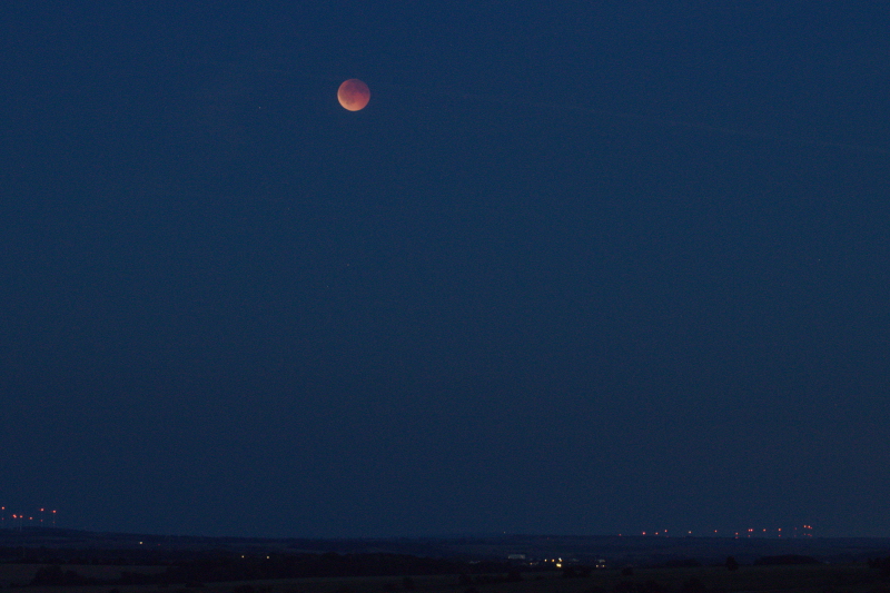 Sonnenuntergang war um 19:59. Mit der Beobachtung begannen wir kurz nach 20 Uhr; da war noch nichts zu sehen. Es dauerte etwa zwanzig Minuten, bis ein Beobachter den Mond im Dunst entdeckte. Da war der Mond schon 5° überm Horizont, und der Höhepunkt der Verfinsterung war bereits zehn Minuten vorüber. Das Foto oben zeigt diesen Moment. Das untere Foto entstand um 20:43, nur etwa eine Viertelstunde vor Ende der Totalität.