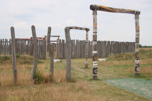 Das betrifft in diesem Fall besonders die Muster, Symbole und Farben, mit denen die Pfosten und auch die anderen Gegenstände verziert sind. Die Archäologen orientierten sich nach eigenen Aussagen an erhalten gebliebenen Funden aus der gleichen Epoche - der sogenannten Glockenbecherzeit.Diese Funde waren mit klaren geometrischen und farbigen Formen verziert. Die Form der Palisaden mit zwei Pfosten und querliegendem Balken erinnert an die Bauart von Objekten wie dem Steinkreis von Stonehenge.