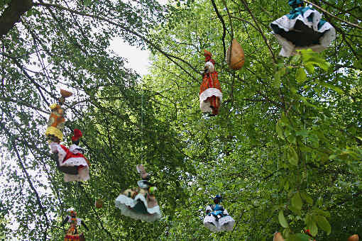 Installation um einen Baum und Performance, Stoff, Eisendraht, Farben, Netz, Holz, 1:15 min