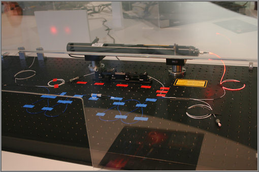 Das Glasfaserkabel leitet das Licht in einen Optokoppler. Dort wird es in zwei parallele Wellen aufgespaltet, die in je einem Glasfaserkabel weitergeleitet werden (rotes bzw. blaues Klebeband). In einem zweiten Koppler werden beide Partialwellen in Überlagerung (Superposition) gebracht. Die beiden Outputs des Kopplers sind auf dem Bildschirm zu sehen, wobei einer die Summe, der andere die Differenz beider Wellen darstellt. Ihr relative Helligkeit kann durch Berühren eines Kabels, d.h. durch Änderung der Phase zwischen beiden Wellen beeinflußt werden. Die Summenintensität ist konstant.