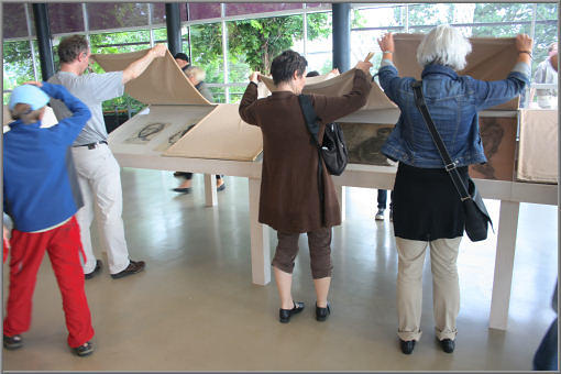 Seine Gemälde hat der Künstler auf schrägen, pultartigen Schaukästen unter Decken verborgen. Der Betrachter muß sie lupfen. Wenn man durch die Doppelreihen hindurch ist, sind einem die Arme schwer geworden.