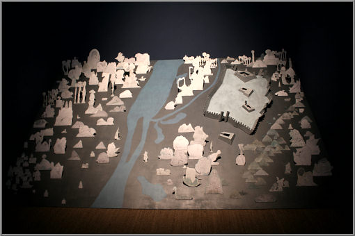 Der Ägypter zeigt Videos, in denen in einem grandiosen und farbenprächtigen Marionettenspiel die Geschichte der Kreuzritter nachgespielt wird. Das Bild zeigt ein Modell der Puppenbühne.