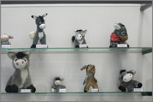 Der Künstler hat das Bild vom störrischen Esel aufgegriffen, eine Auswahl von fünfzig prominenten Widerstandskämpfern (Rosa Luxemburg und Pablo Neruda seien hier stellvertretend genannt) getroffen und für jede Person symbolisch einen Stoffesel in eine Vitrine gestellt.